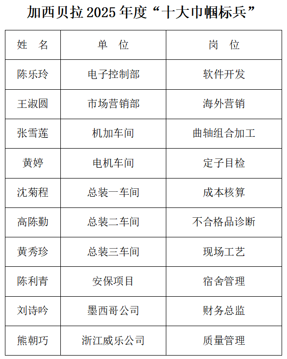 為表彰先進(jìn)、樹立典型,在各黨支部的領(lǐng)導(dǎo)和各單位行政的支持下,各分工會(huì)對(duì)2025年度公司“十大巾幗標(biāo)兵”組織民主推薦,經(jīng)公司女職委初審,公司工會(huì)委員會(huì)審批,并報(bào)請(qǐng)公司黨委同意,評(píng)選出加西貝拉2025年度“十大巾幗標(biāo)兵”。公司黨政班子成員徐耀法、謝建峰、王悅和各工廠廠長(zhǎng)、女工委負(fù)責(zé)人,到“她”的工作崗位,為“十大巾幗標(biāo)兵”頒獎(jiǎng)。